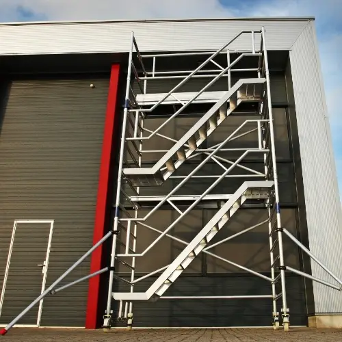 Trappentoren huren? Een trappentoren is handig wanneer je met materiaal naar boven moet lopen in het steiger. De trappentoren kent verschillende lengtes waardoor voor al jouw klussen, de juiste toren gekozen kan worden. Dankzij de inwendige trappen met leuning loop je veilig en gemakkelijk omhoog.