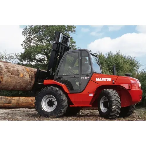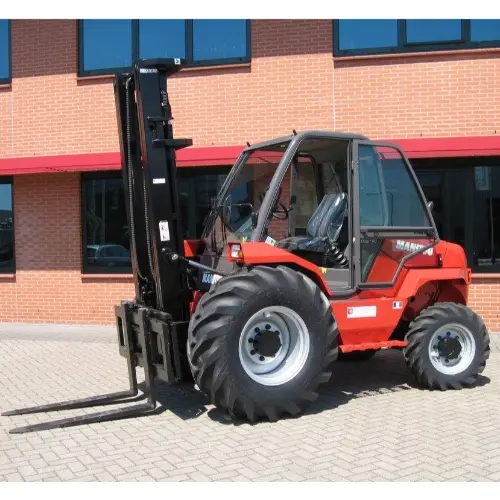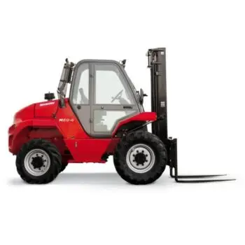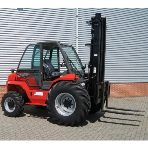 Door het ontwerp van deze 3 ton heftruck van Manitou en de vierwielaandrijving kan er eenvoudig gemanoeuvreerd worden over een ruw terrein.