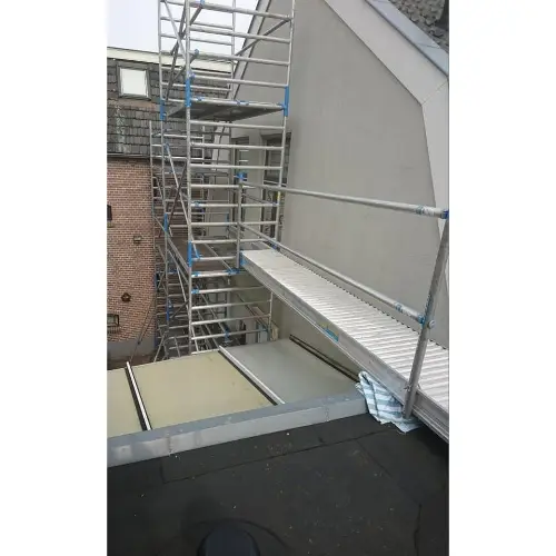 Een loopbrug van 5 meter is ideaal om te huren voor het overbruggen van obstakels zoals erkers of poorten. Met de aluminium loopbrug kun je 4 meter afstand tussen rolsteigers overbruggen. De loopbrug is extra veilig door de anti-slipvloer en de schoprand.