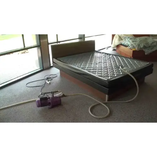 Waterbedpomp 4 m³ huren? Je kunt een waterbedpomp huren als je op een veilige manier je watermatras wilt leeghalen. Een waterbedpomp is ervoor om watermatras vacuüm te pompen. Zodat de stabilisatie lagen op hun plaats blijven liggen. Hierdoor kun je de volgende keer je waterbed weer oppompen zonder dat deze beschadigd is. Als je namelijk met een tuinslag het matras leeg haalt, dan heb je een grote kans dat de stabilisatie lagen op een hoop komen. Er zit stabilisatie in een waterbed om twee redenen. Allereerst zorgt de stabilisatie voor minder nabeweging in het watermatras nadat je in bed bent gestapt of als je je omdraait. Hoe hoger de stabilisatie, hoe minder nabeweging. De tweede reden is dat de stabilisatie ondersteuning biedt. Met name aan mensen met rugklachten of die iets zwaarder zijn. Dan is het prettig dat je niet te ver wegzakt in het watermatras en dat je lichaamsgewicht goed wordt verdeeld.
